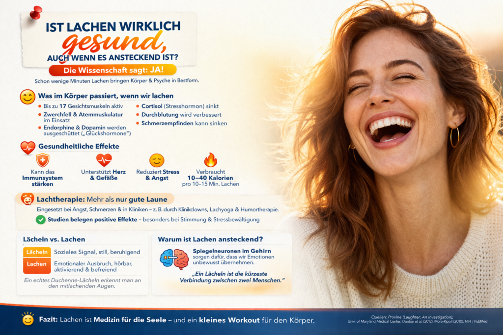 Ein echtes Lachen ist Hochleistungssport für den Körper. Bis zu 17 Gesichtsmuskeln sind beim Lächeln aktiv, beim intensiven Lachen sogar deutlich mehr – inklusive Zwerchfell und Atemmuskulatur.