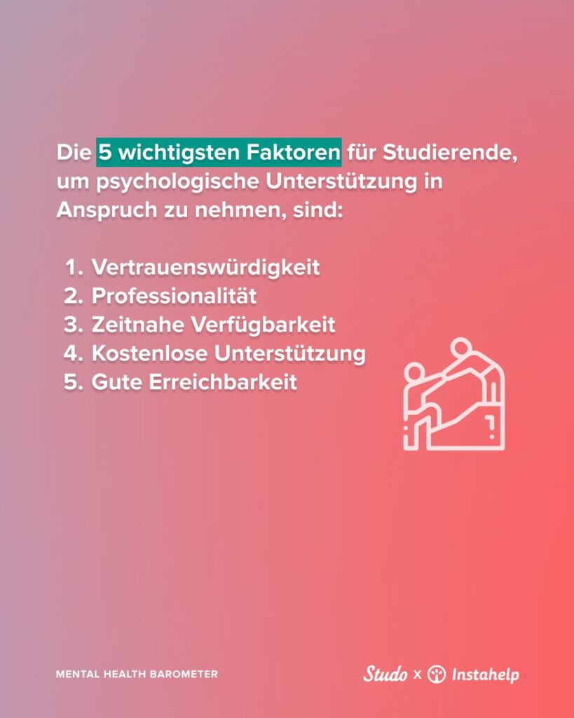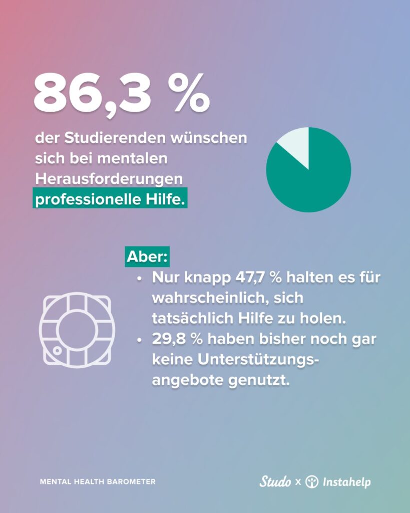 Die Bereitschaft, Hilfe zu suchen, ist groß: 86,3 Prozent der Studierenden wünschen sich bei mentalen Problemen professionelle Unterstützung. Doch nur knapp die Hälfte (47,7 Prozent) hält es für realistisch, diesen Schritt auch tatsächlich zu gehen. Gerade Studentinnen wären eher bereit, Hilfe anzunehmen, wenn die Rahmenbedingungen stimmen.