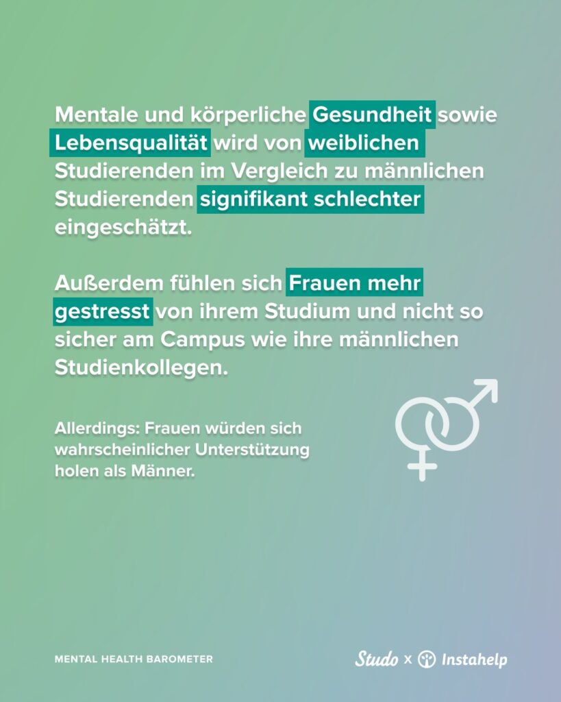 Ein Blick auf die Geschlechter zeigt klare Unterschiede: Studentinnen geht es psychisch wie körperlich signifikant schlechter als ihren männlichen Kommilitonen. Sie fühlen sich stärker gestresst, erleben globale Krisen sowie soziokulturelle Konflikte als intensivere Belastung für Psyche, Wohlbefinden und Studienleistung und fühlen sich am Campus deutlich weniger sicher.