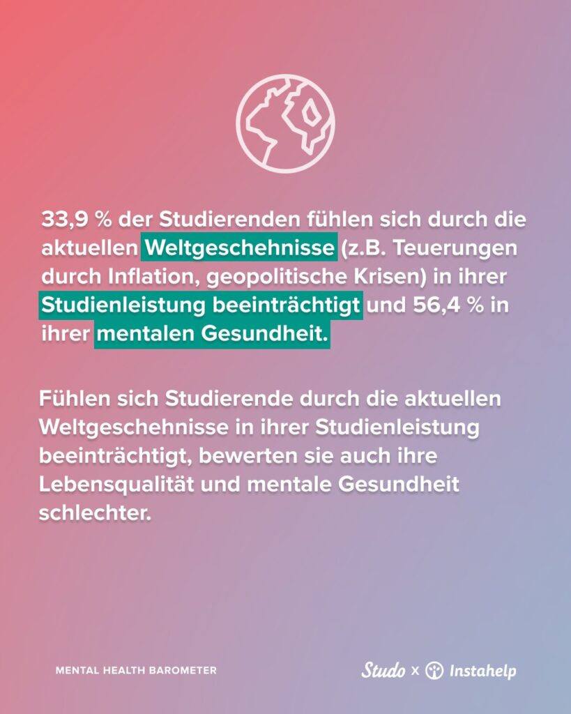 Mehr als die Hälfte der Studierenden (56.4 Prozent) fühlt sich durch die aktuellen Weltgeschehnisse (Inflation, geopolitische Krisen) in ihrer mentalen Gesundheit beeinträchtigt und 33.9 Prozent fühlen sich dadurch in ihrer Studienleistung beeinträchtigt.