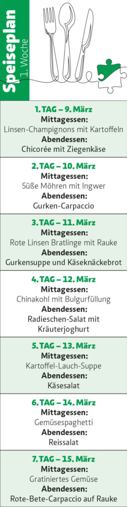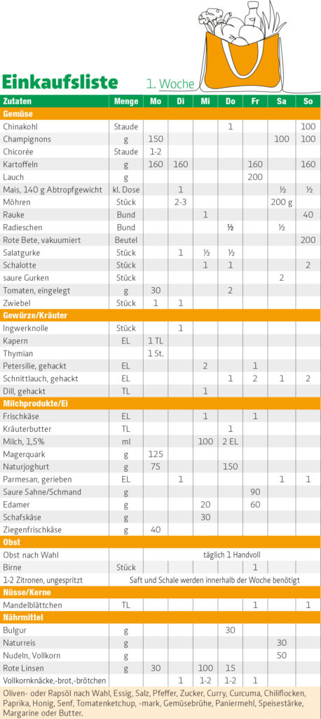 Das sind die Einkaufsliste und der Speiseplan für die 1. Woche der PZ/AOK-Frühjahrskur vom 9. März bis 15. März