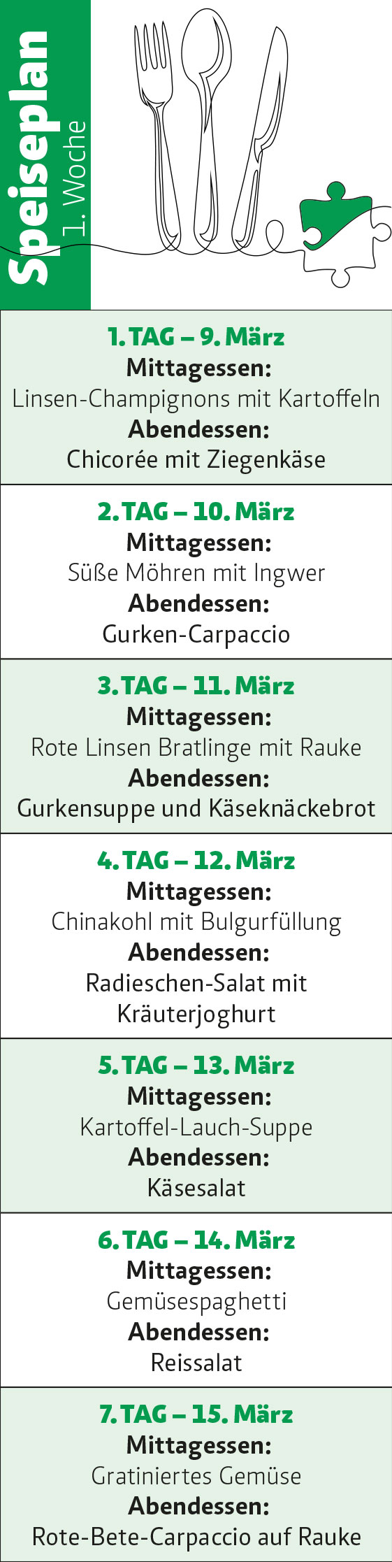 Die Aktion läuft vom 9. März bis zum 29. März. In diesem Zeitraum heißt es dann: „Gesund und lecker essen mit der vegetarischen Trendküche“. Hier finden Sie schon mal die Rezepte für den 1. Tag nebst Einkaufsliste und Speiseplan.